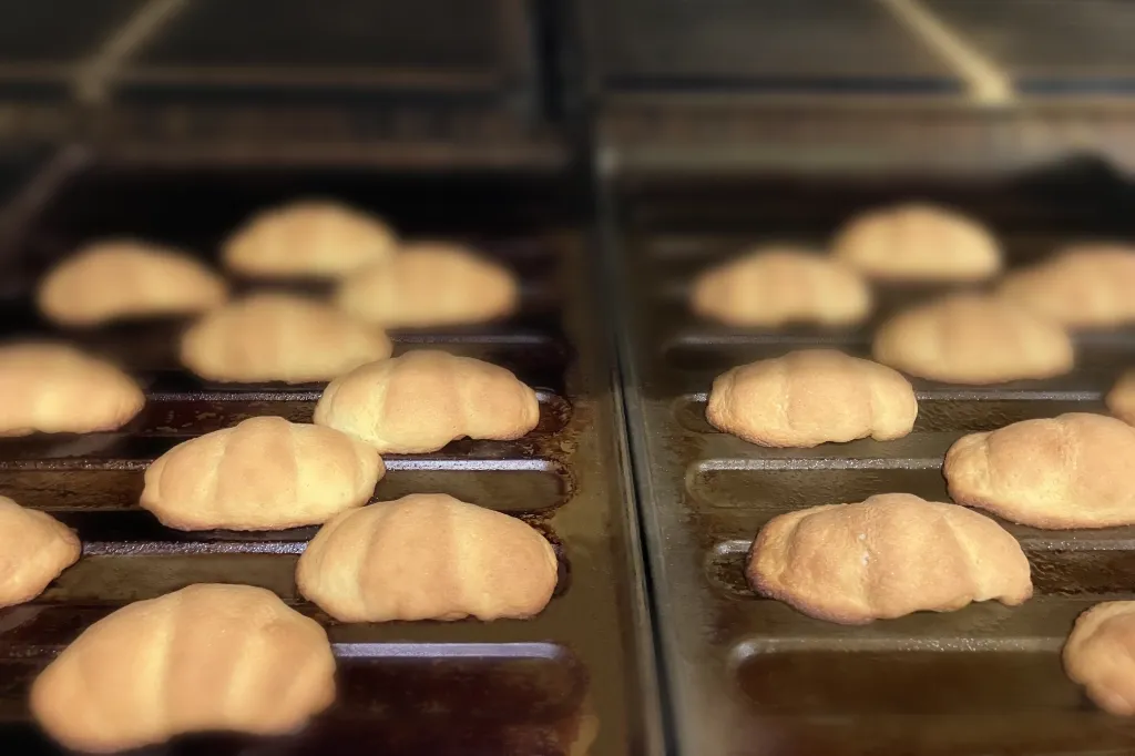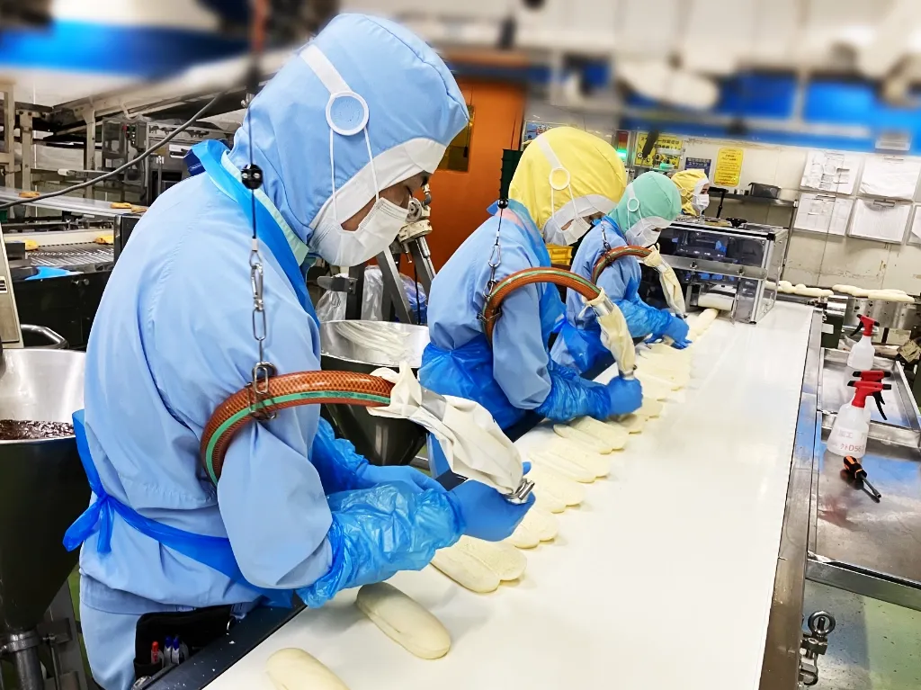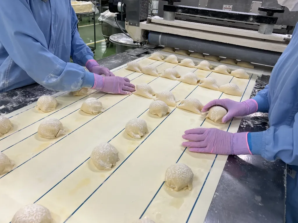 製造課では、冷凍パン生地や洋菓子の焼成・トッピング・包装を担当し、365 日稼働体制で主にコンビニエンスストア向けの商品を製造しています。品質にこだわり、焼き上がりや仕上げを丁寧に行い、安心・安全で美味しいパンを提供することで、お客様に喜ばれる商品づくりを目指しています。