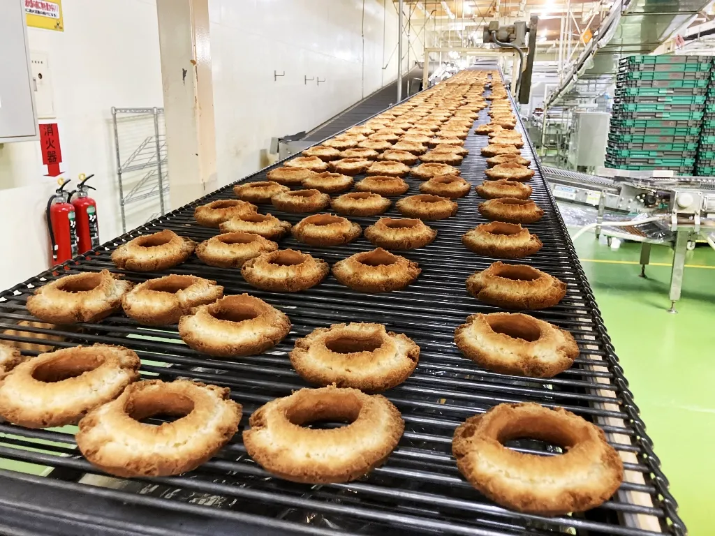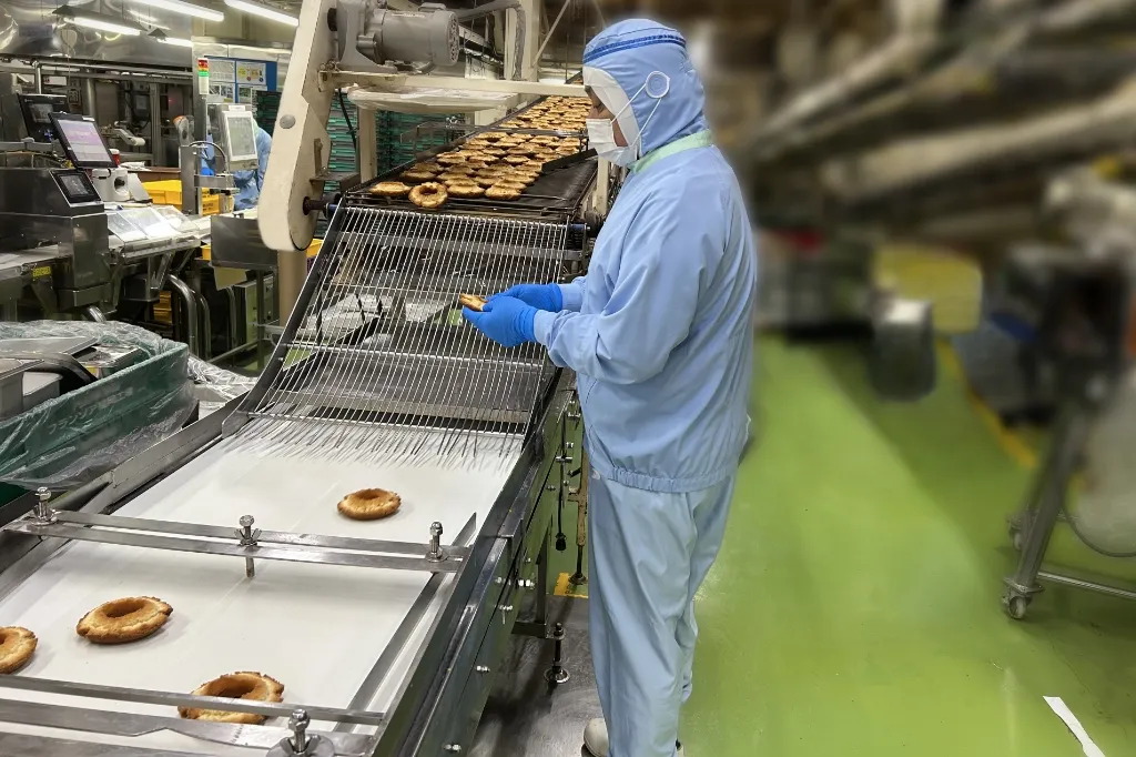 ドーナツ・フランスパン部門では、24 時間 365 日稼働体制で主にコンビニエンスストア向けの商品を製造しています。焼成油調・トッピング・包装を担当し、美味しさと品質にこだわった製品づくりを実現。徹底した衛生管理のもと、安心してお召し上がりいただける美味しい商品をお届けするため、日々努力を重ねています。